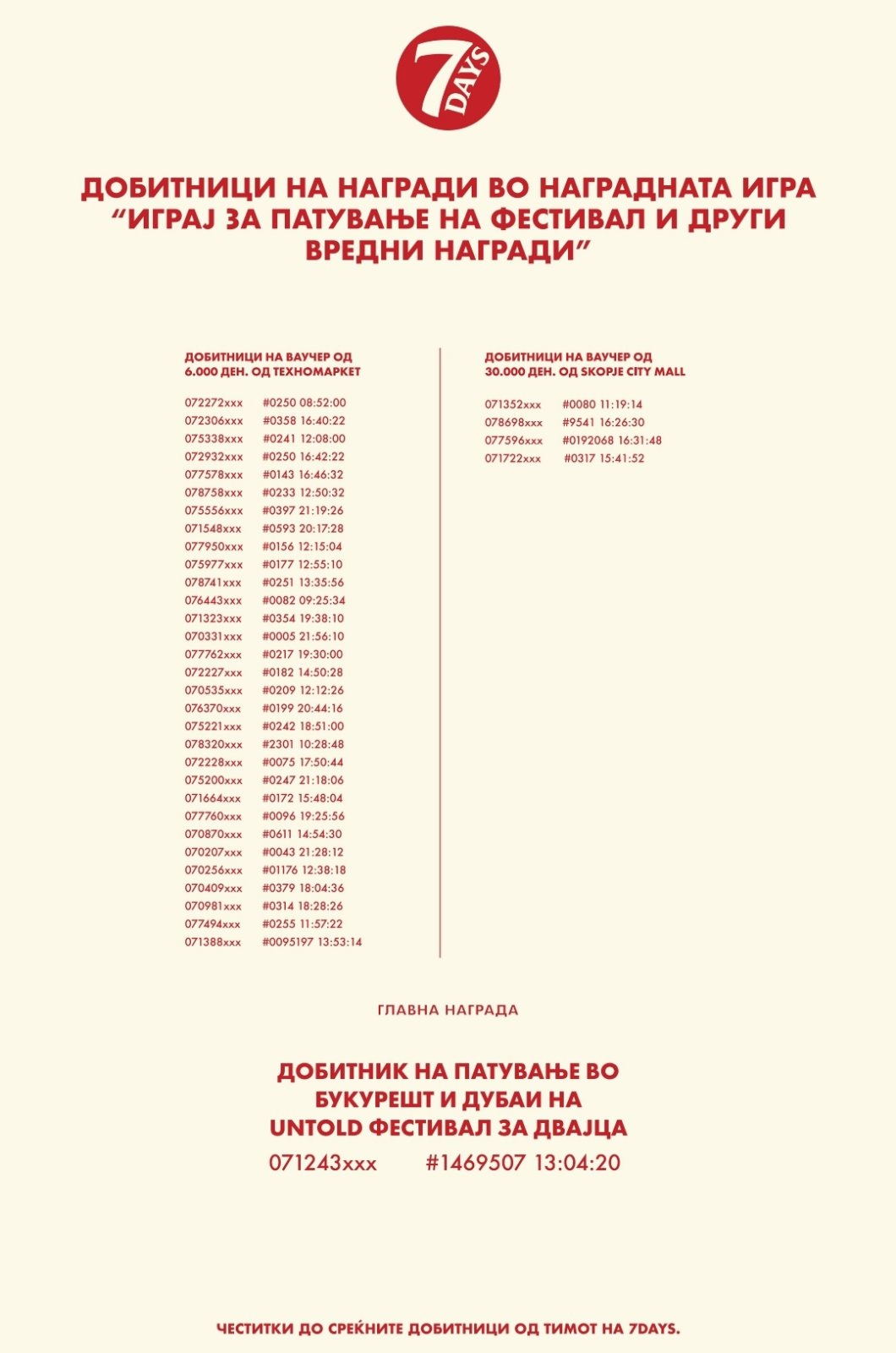 Во наградната игра, право на учество имаат сите лица над 18 години, кои се граѓани на Република Северна Македонија и ги исполнуваат условите на учество (во понатамошниот текст „Учесници“). Со купување на било кои 2 производи од брендот 7 DAYS кои се веќе наведени во Член 5, на една фискална сметка, учесниците ќе може да учествуваат во наградната игра преку испраќање СМС порака на бројот 149-914 од операторите Македонски Телеком и А1 во Република Северна Македонија, со следната содржина: БРОЈ НА ФИСКАЛНА СМЕТКА (празно место) ВРЕМЕ НА КУПУВАЊЕ НА ПРОИЗВОДИТЕ (пример на формат за СМС порака #0250 16:13:00).