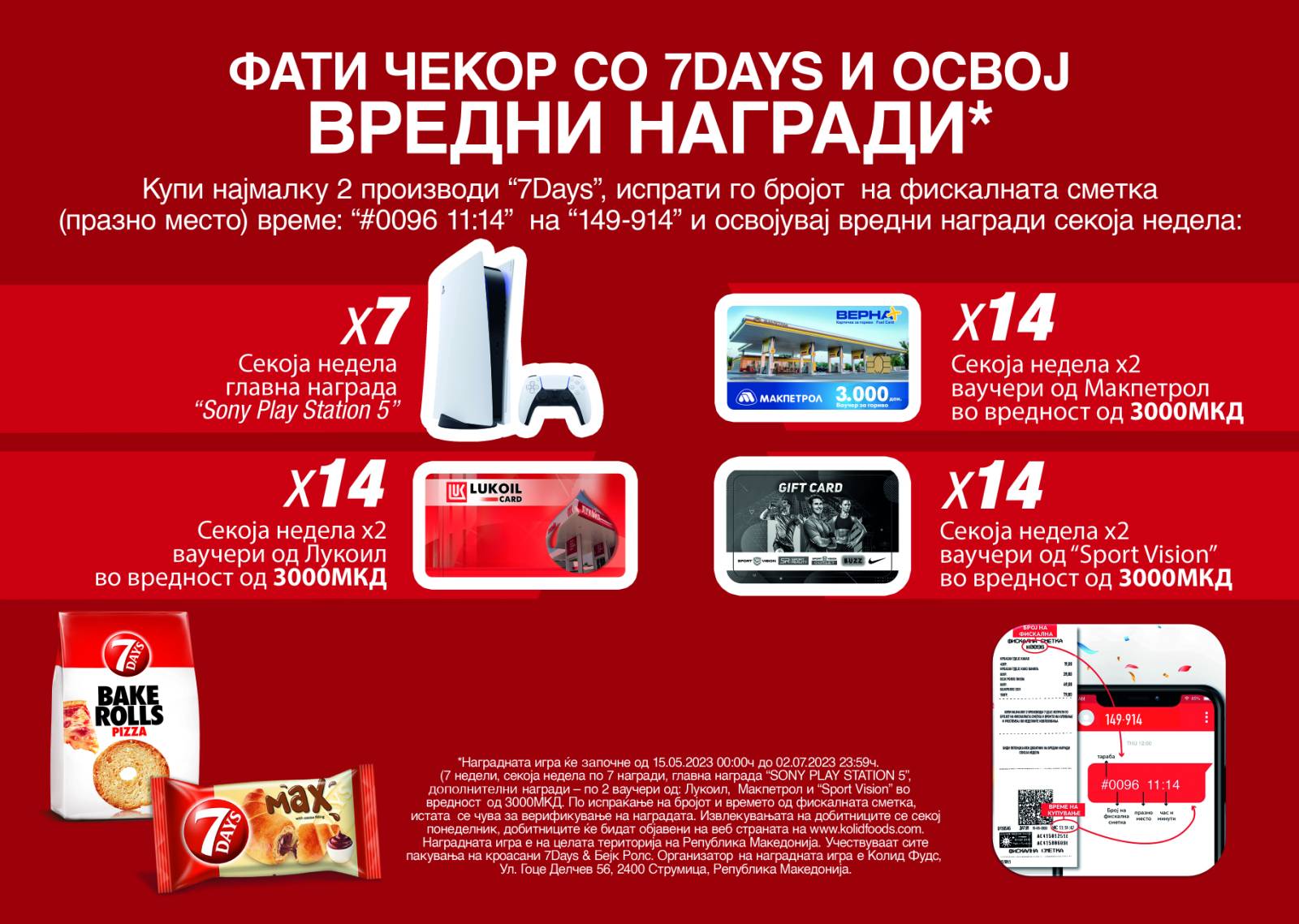 Учесниците за наградната игра, ќе може да испратат СМС започнувајќи од 15.05.2023 г., од 00:01 часот, па се до 02.07.2023 г., 23:59 часот, по што СМС платформата ќе биде затворена. Со учество во наградата игра, учесниците потврдуваат дека ги разбираат условите и се согласуваат со правилата за учество.