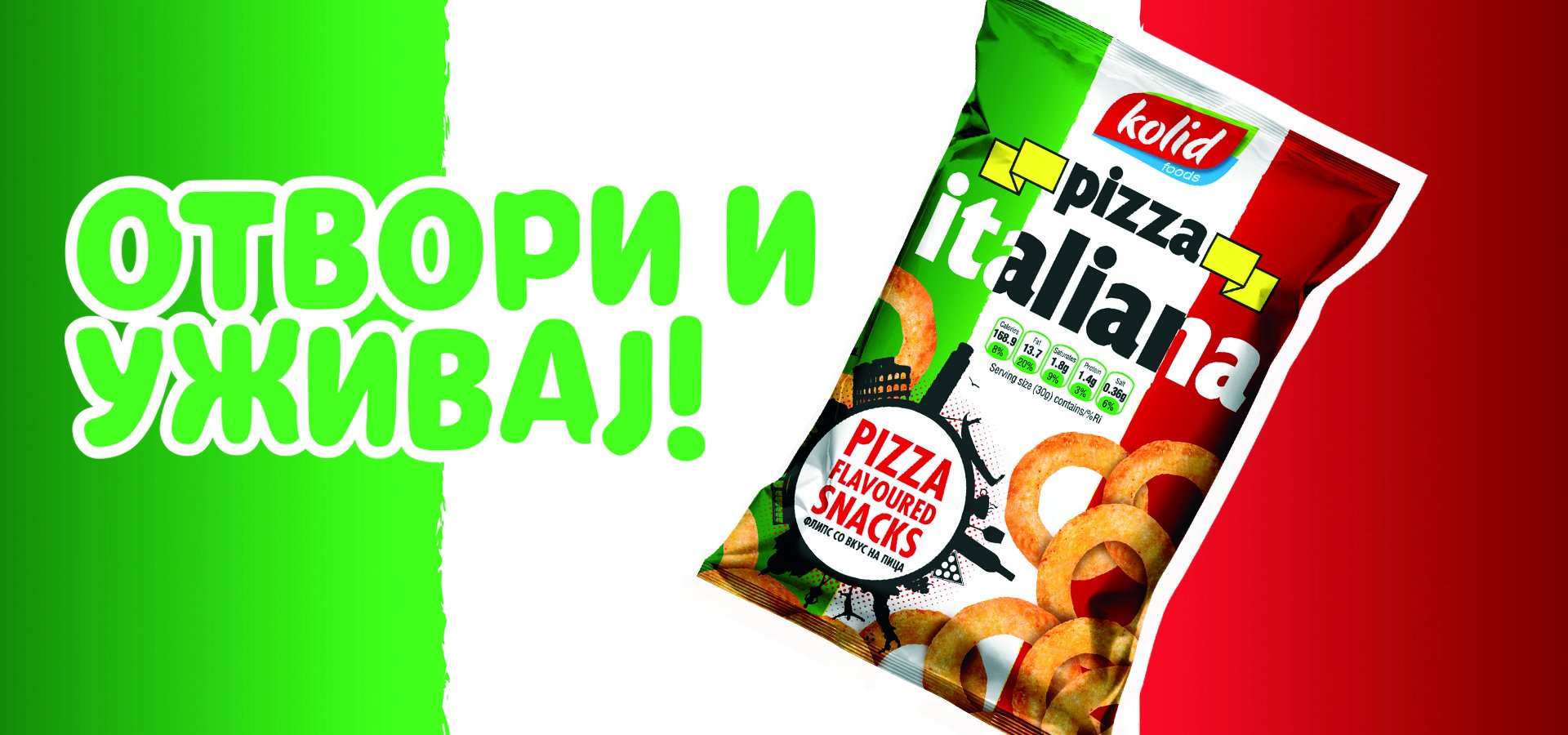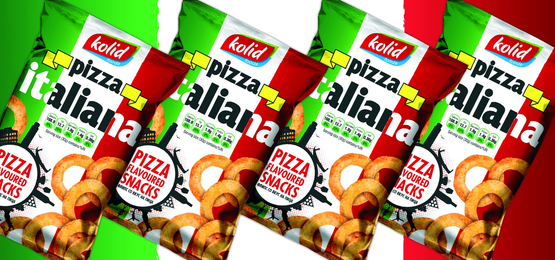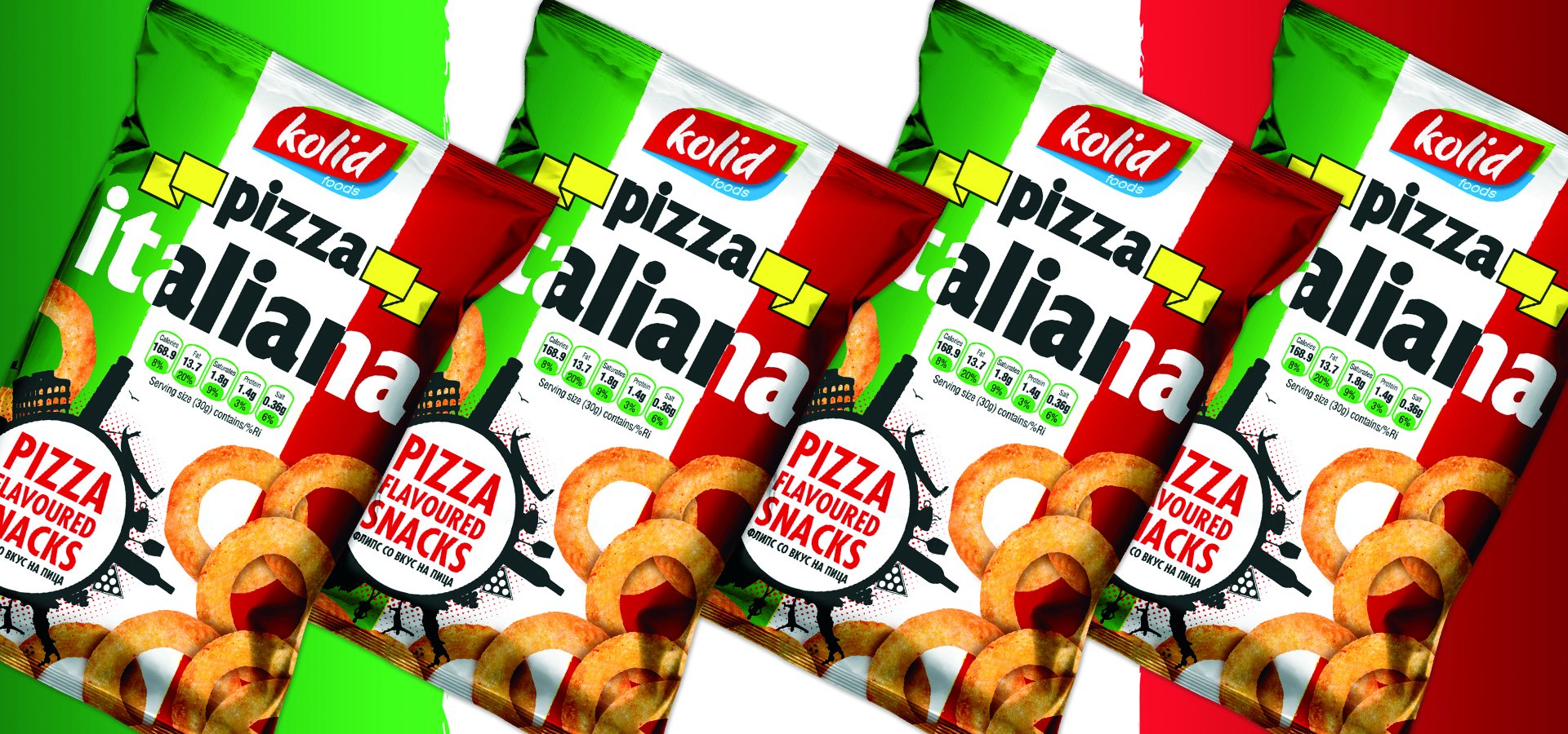 Колид е производител на еден од водечките флипсови со вкус на пица Pizza Italiana. Pizza Italiana е вкусна и крцкава ужинка направена да стане сечие омилено хоби. Тоа е првиот Македонски флипс со вкус на пица. Првиот сладок одговор на желбата на оние кои едноставно го обожаваат вкусот на италијанската пица. За да се добие оваа совршена комбинација на пица вкус и житарици, процесот на неговото производство опфати долг период на тестирање. При производството на Pizza Italiana користиме природни хранливи состојќи, бидејќи Вашето здравје и благосотојба отсекогаш се наш приоритет. Содржината на Pizza Italiana е внимателно избрана, и продуцира полесна и покревка ужинка од кога и да е. Но, она што најмногу го издвојува овој флипс е неговото прецизно зачинување, со што целосно се задржува вкусот и аромата на светски најпознатиот вкус – италијанска пица. Кревката и лесна Pizza Italiana ужинка, со својот совршен вкус, е одличен избор за Вас, за било која ситуација, во било кое време. Додека гледате телевизија или пиете ладно пиво со пријателите, додека се забавувате во природа или сакате некого пријатно да изненадите... Без сомнение, веднаш ќе ја засакате. Пробајте ја и уверете се.