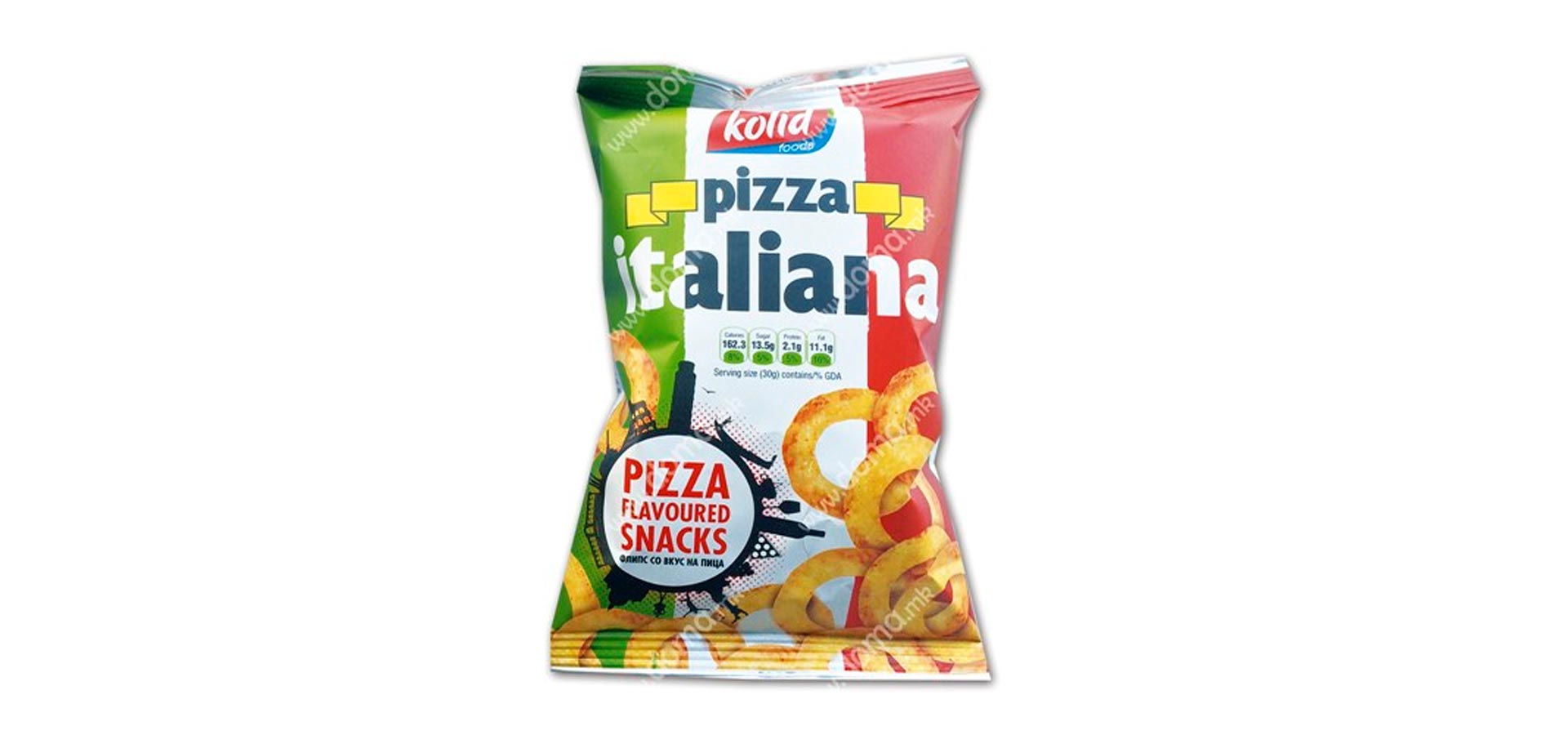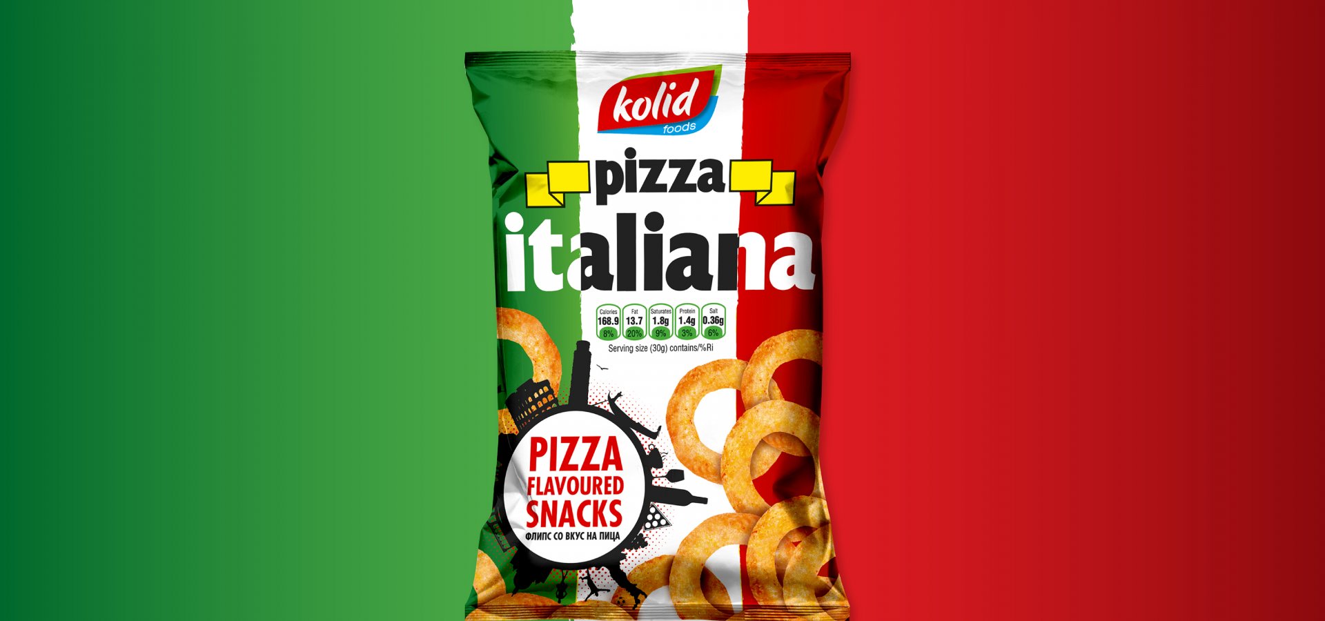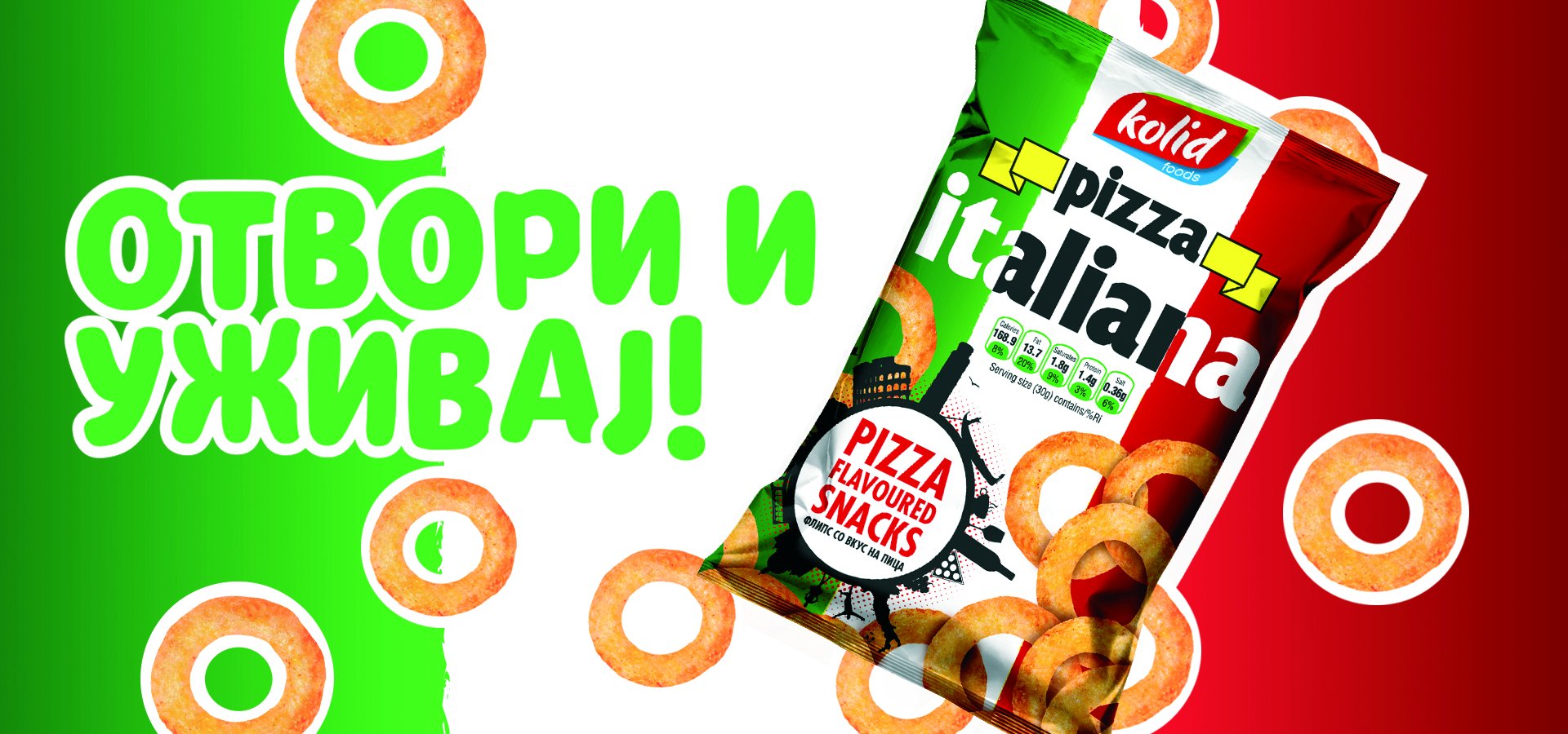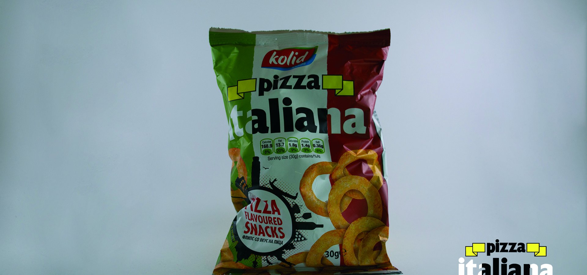 Колид е производител на еден од водечките флипсови со вкус на пица Pizza Italiana. Pizza Italiana е вкусна и крцкава ужинка направена да стане сечие омилено хоби. Тоа е првиот Македонски флипс со вкус на пица. Првиот сладок одговор на желбата на оние кои едноставно го обожаваат вкусот на италијанската пица. За да се добие оваа совршена комбинација на пица вкус и житарици, процесот на неговото производство опфати долг период на тестирање. При производството на Pizza Italiana користиме природни хранливи состојќи, бидејќи Вашето здравје и благосотојба отсекогаш се наш приоритет. Содржината на Pizza Italiana е внимателно избрана, и продуцира полесна и покревка ужинка од кога и да е. Но, она што најмногу го издвојува овој флипс е неговото прецизно зачинување, со што целосно се задржува вкусот и аромата на светски најпознатиот вкус – италијанска пица. Кревката и лесна Pizza Italiana ужинка, со својот совршен вкус, е одличен избор за Вас, за било која ситуација, во било кое време. Додека гледате телевизија или пиете ладно пиво со пријателите, додека се забавувате во природа или сакате некого пријатно да изненадите... Без сомнение, веднаш ќе ја засакате. Пробајте ја и уверете се.